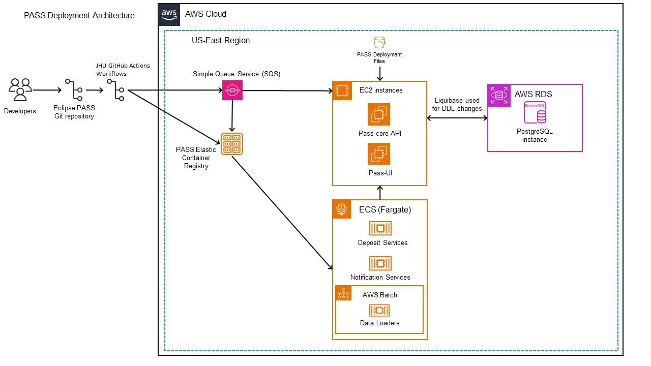 The deployment workflow starts when developers contribute code to the Eclipse PASS Git repository. Changes in this repository trigger GitHub Actions workflows, which are part of an automated CI/CD pipeline facilitating the deployment of the updated code. In deployment SQS is utilized for initiating the deployment from a GitHub workflow that publishes a SNS topic to the queue. The PASS deployment files contain configurations and environment variables that assist in the deployment of the PASS application and supporting services. Liquibase is utilized to manage database schema changes, which interacts with an AWS RDS instance running PostgreSQL.